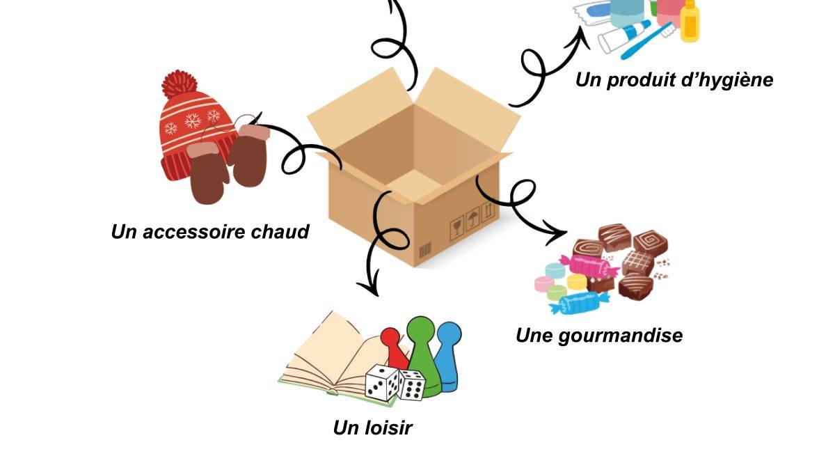 Le principe est simple, offrir à une personne un accessoire chaud, des douceurs, un produit d’hygiène, un loisir/un jeu et un mot doux/dessin. Tout le monde peut y participer.