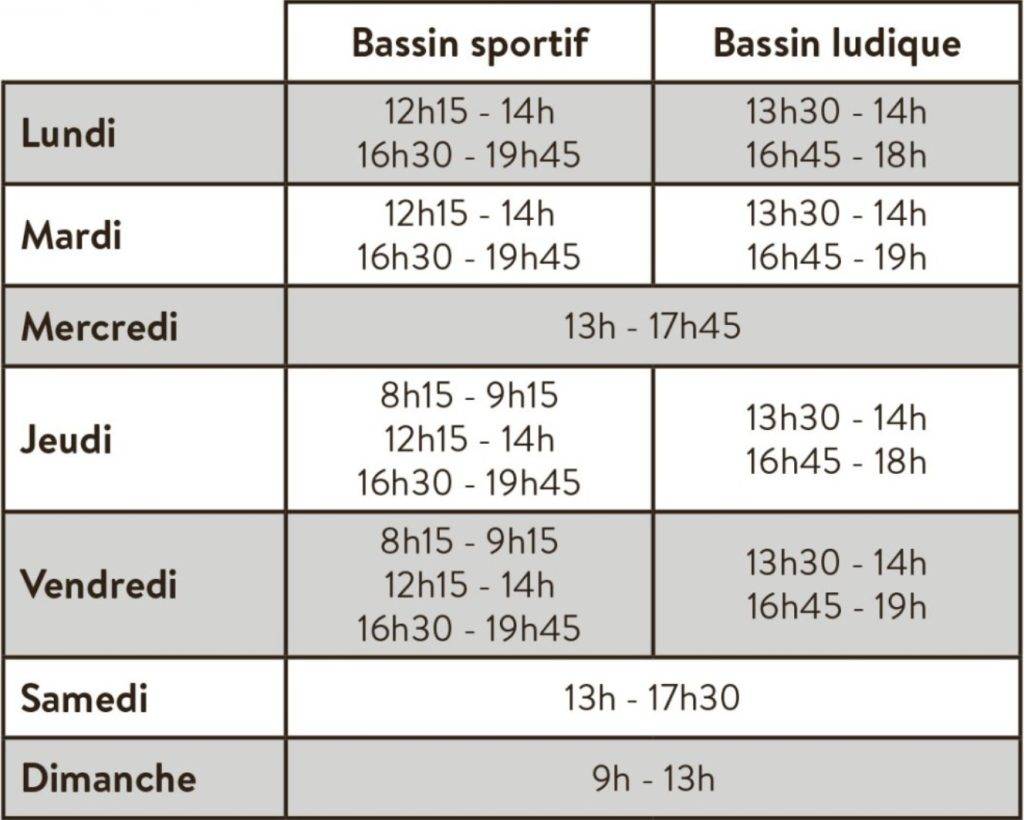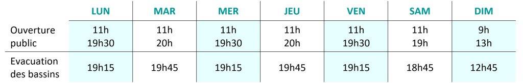 Fermeture de la caisse 45 min, évacuation des bassins 15 min avant l’horaire indiqué.