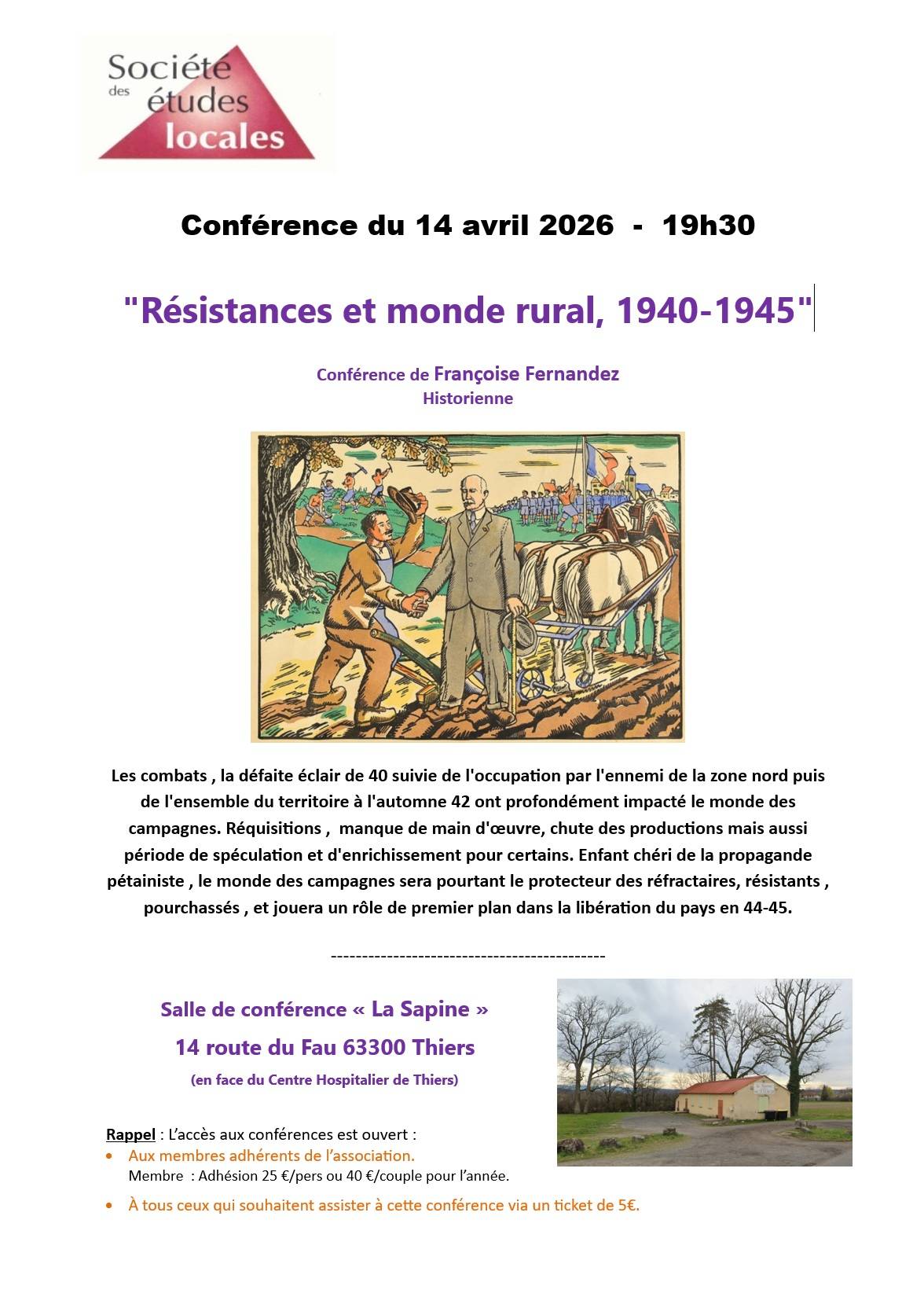 Conférence organisée par la Société des Etudes Locales de Thiers : “Résistances et monde rural, 1940-1945” par Françoise Fernandez – Historienne