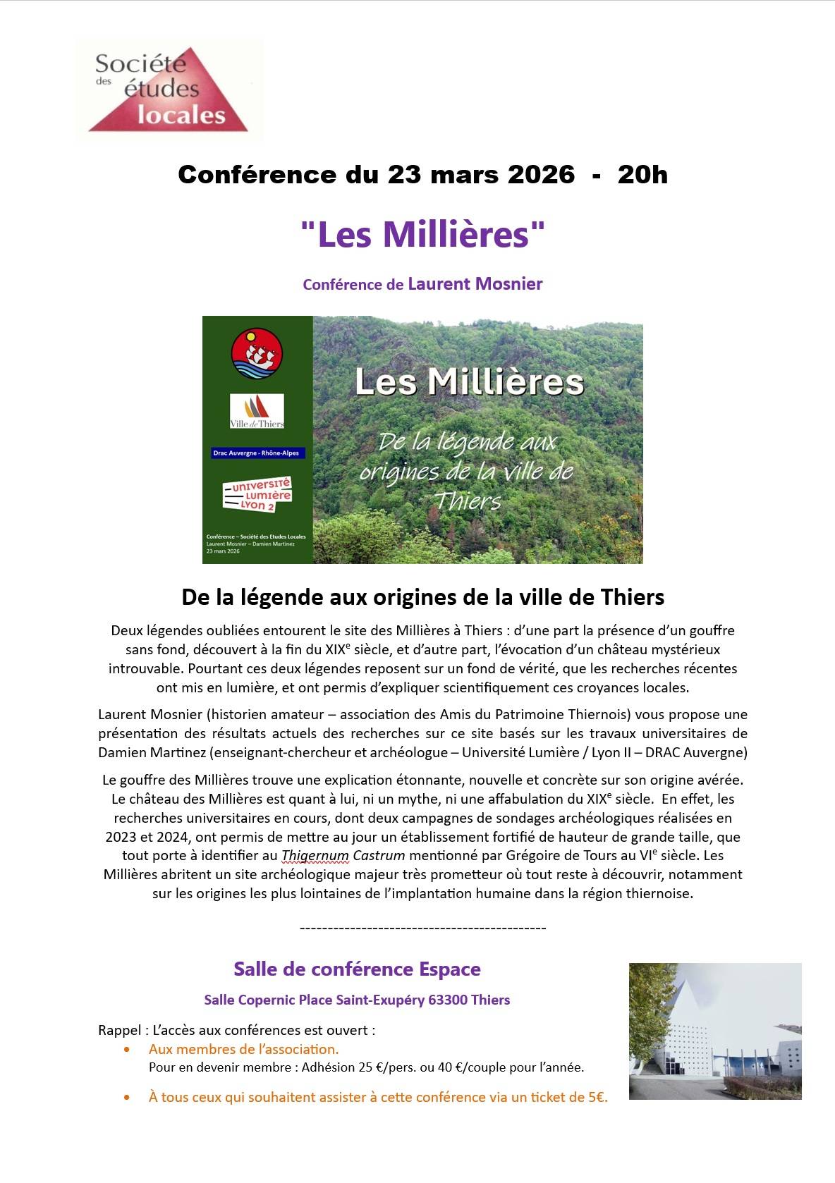 Le lundi 23 mars à 20h en Salle Copernic à Espace, la Société des Etudes Locales de Thiers organise une conférence : “Les Millières” De la légende aux origines de la ville de Thiers par Laurent Mosnier suivant les travaux de Damien Martinez (enseignant-chercheur et archéologue – Université Lumière / Lyon II – DRAC Auvergne)