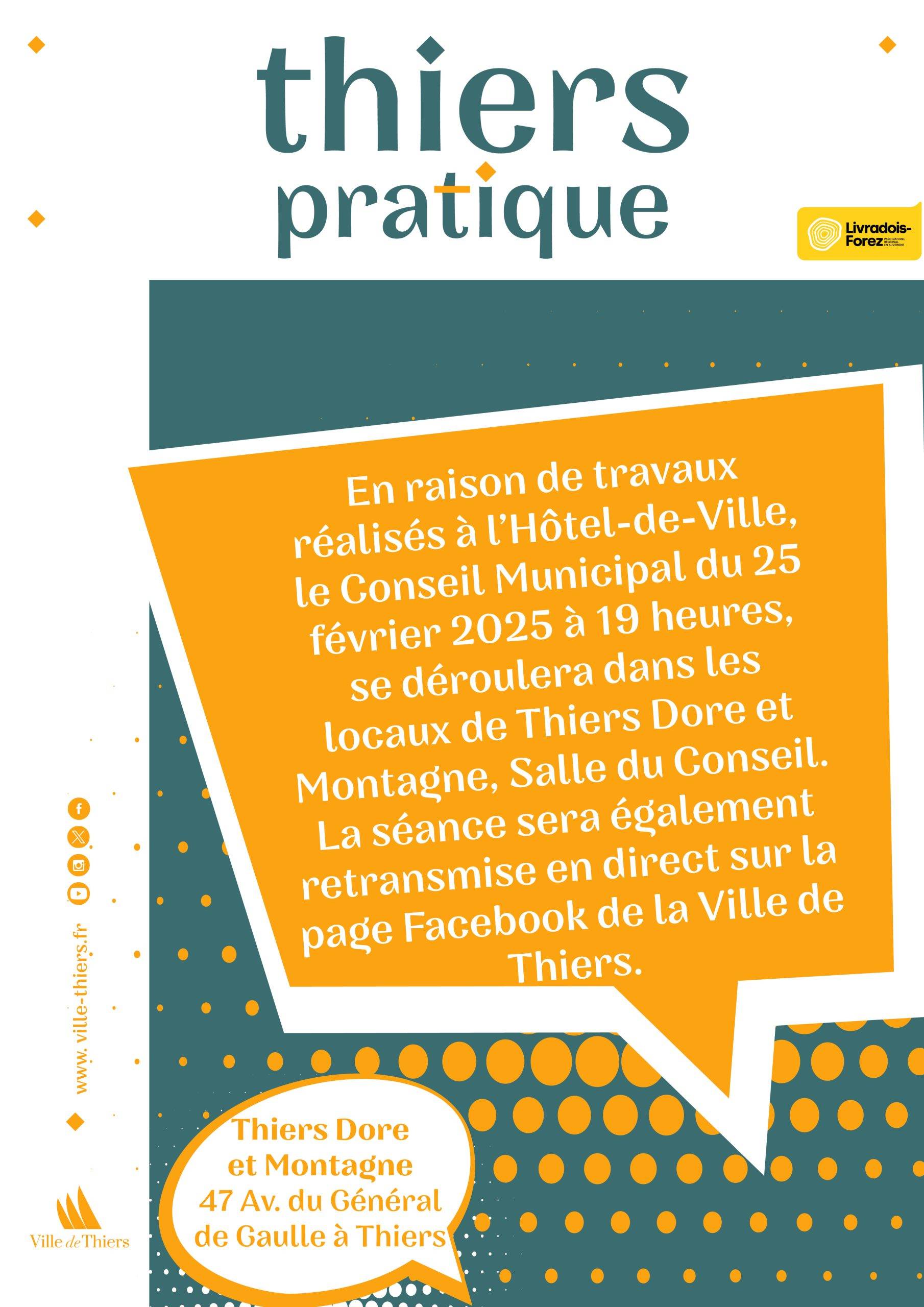 En raison de travaux réalisés à l’Hôtel-de-Ville, le Conseil Municipal du 25 février 2025 à 19 heures, se déroulera dans les locaux de Thiers Dore et Montagne, Salle du Conseil, 47 Av. du Général de Gaulle à Thiers.