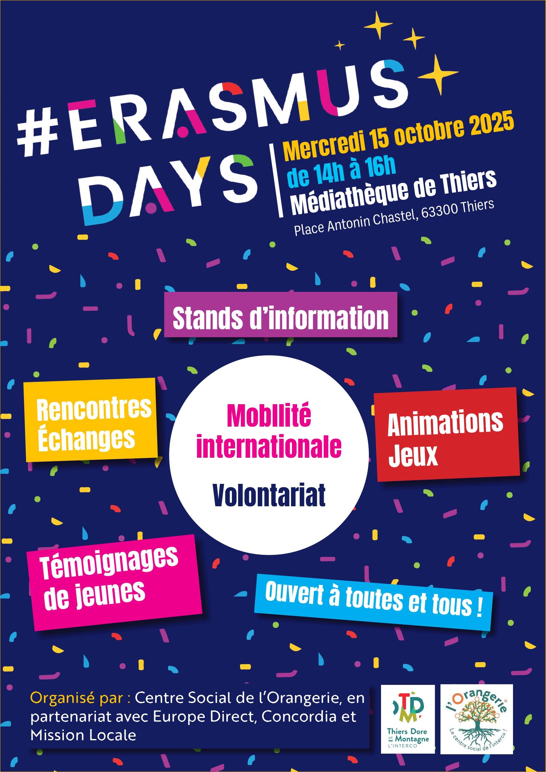 Dans le cadre de la 9e édition des #ErasmusDays, la Médiathèque de Thiers organise un événement spécial le 15 octobre 2025 de 14h à 16h. Cet événement est soutenu par la Communauté de communes Thiers Dore et Montagne (TDM) et le Centre social Intercommunal de l’Orangerie, qui participent activement à l’animation et à la valorisation de la mobilité européenne et des valeurs européennes.