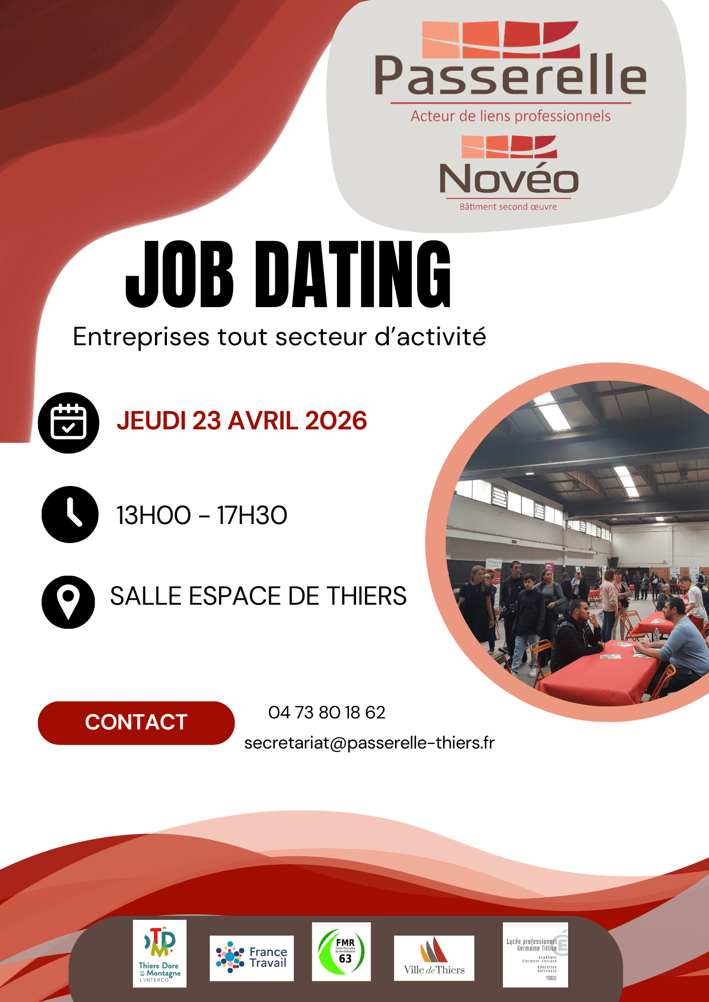 Passerelle et Novéo ont le plaisir d’annoncer la 5ᵉ édition de leur Job Dating, qui se tiendra le jeudi 23 avril 2026 à la Salle Espace, à Thiers.