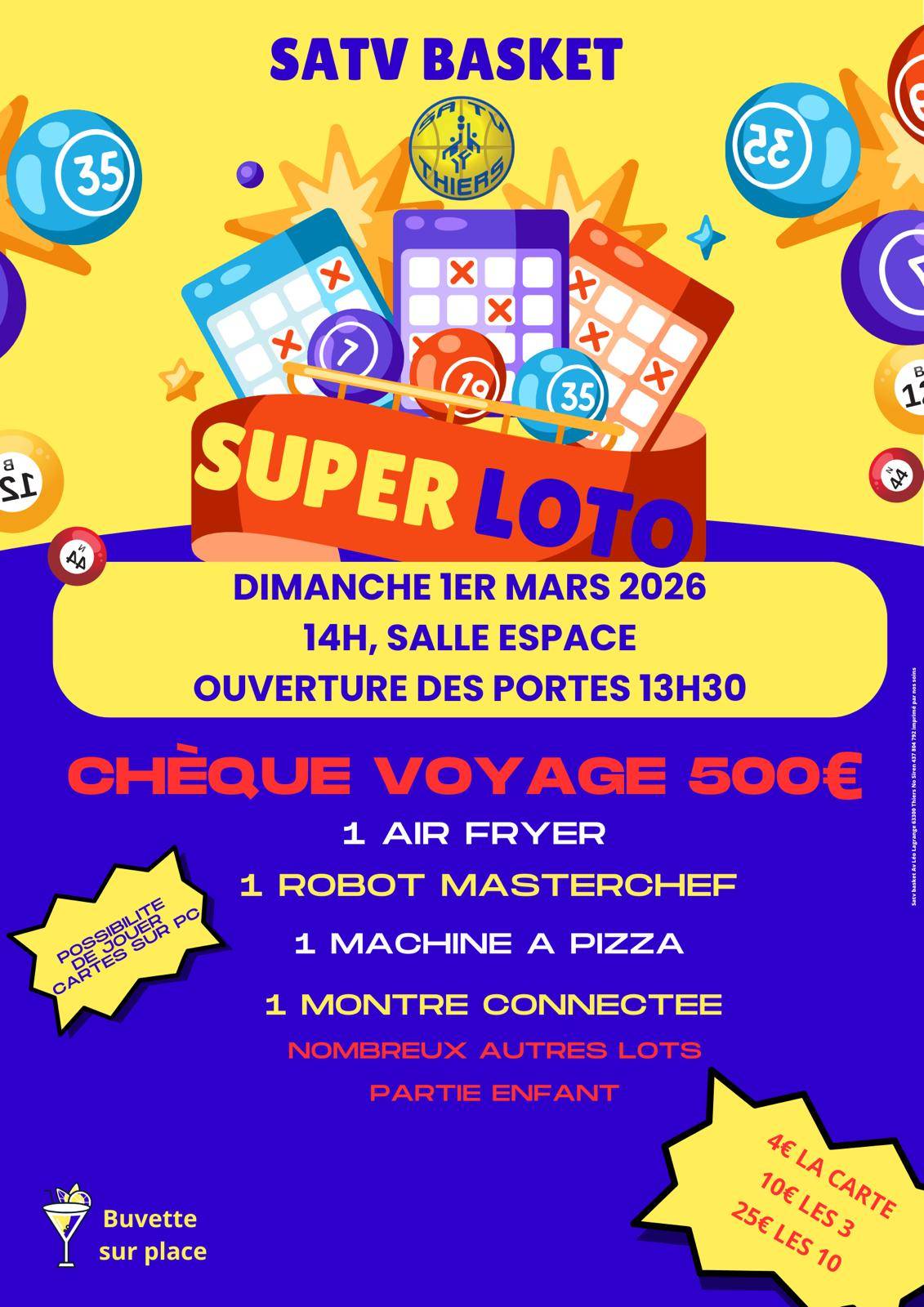 Le loto des SATV Basket aura lieu le Dimanche 1er Mars 2026 à la salle Espace à partir de 14h00.