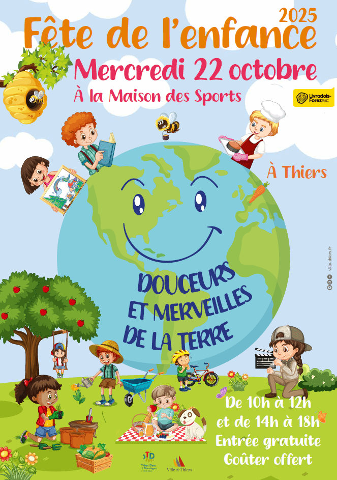 Incontournable des vacances d’automne, la Fête de l’Enfance revient à Thiers pour une journée magique autour du thème “Douceurs et merveilles de la terre”. L’événement, entièrement gratuit, invite enfants et familles à vivre un moment festif, sensoriel et créatif à la Maison des Sports.