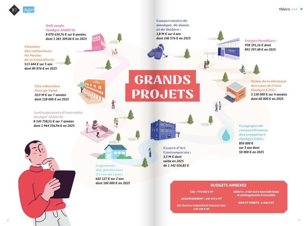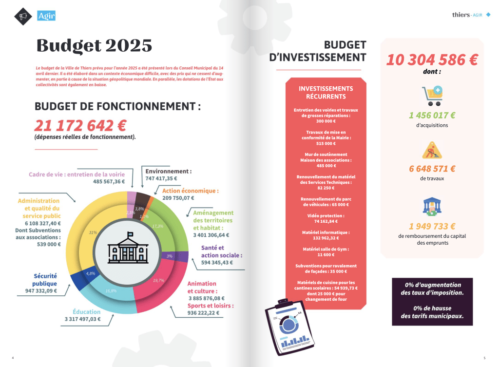 Le budget de la Ville de Thiers prévu pour l’année 2025 a été présenté lors du Conseil Municipal du 14 avril dernier. Il a été élaboré dans un contexte économique difficile, avec des prix qui ne cessent d’augmenter, en partie à cause de la situation géopolitique mondiale. En parallèle, les dotations de l’État aux collectivités sont également en baisse.