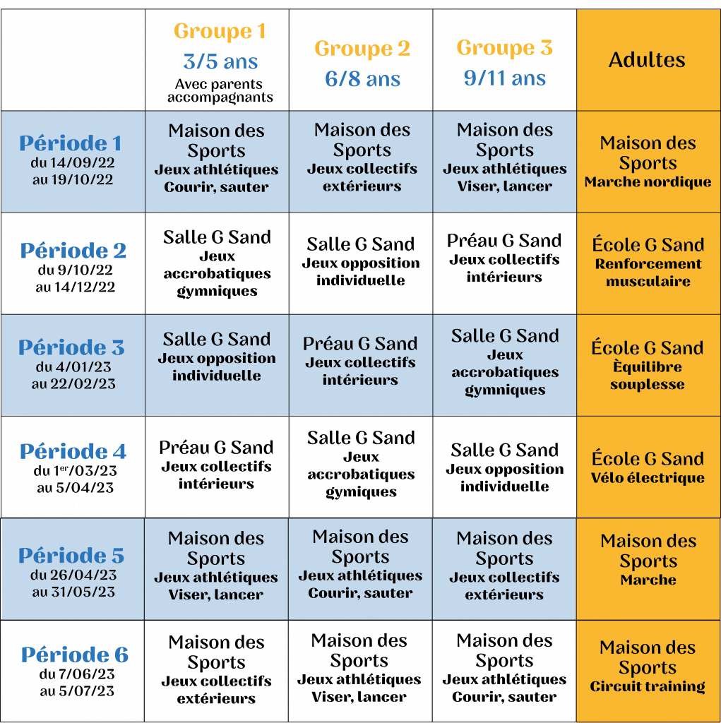 - Du lundi 14 juillet au vendredi 18 juillet, thématique Jeux collectifs, foot, basket, volley et pratique familiale multi-activité